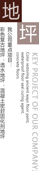 公司主要工程項目有彩色生態混凝土透水地坪,彩色復古地坪,藝術壓花地坪,混凝土密封固化劑地坪,環氧砂漿地坪,環氧防靜電地坪,環氧防滑紋理地坪,環氧玻璃鋼地坪,金剛砂耐磨地坪,水泥基彩色地坪,舊地面的修補,空鼓的治理等。